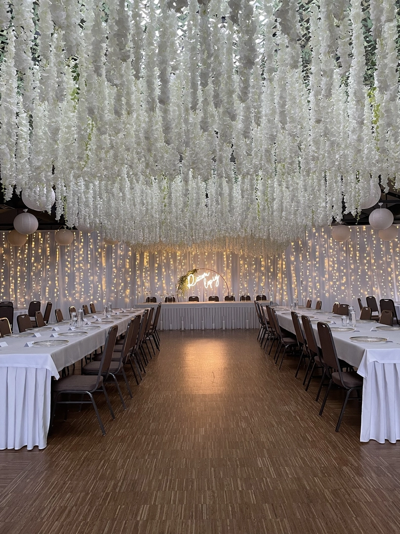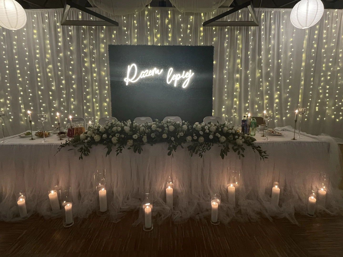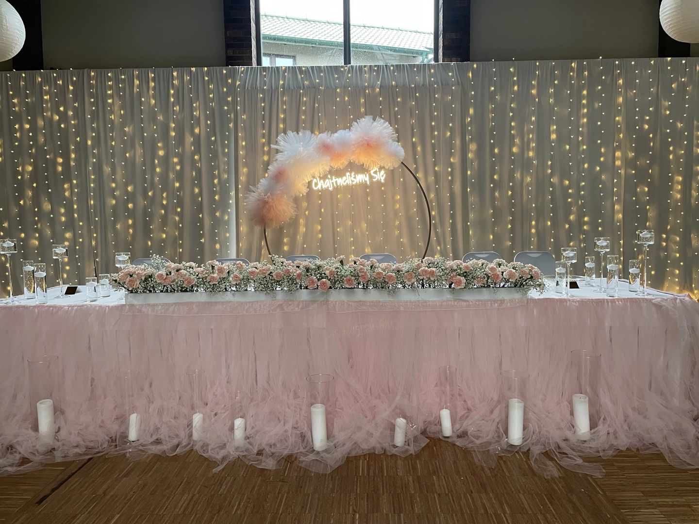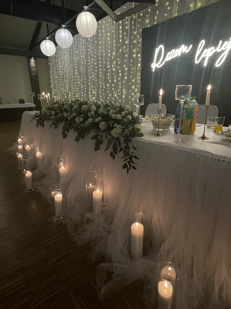 Sala weselna w Zaborowicach koło Mniowa kilkukrotnie wypełniała się naszymi dekoracjami. Sala ta daje duże pole do popisu nienarzucającym się stylem i sporą przestrzenią do montażu ozdób. Tu przede wszystkim chcieliśmy przedstawić część z naszych aranżacji, przede wszystkim na weselach Aleksandry i Michała oraz Klaudii i Kasjana. Pierwsze skrzypce grały tu jasne kolory i oświetlenie, które zgrabnie kontrastowały się z ciemniejszą konstrukcją sali.