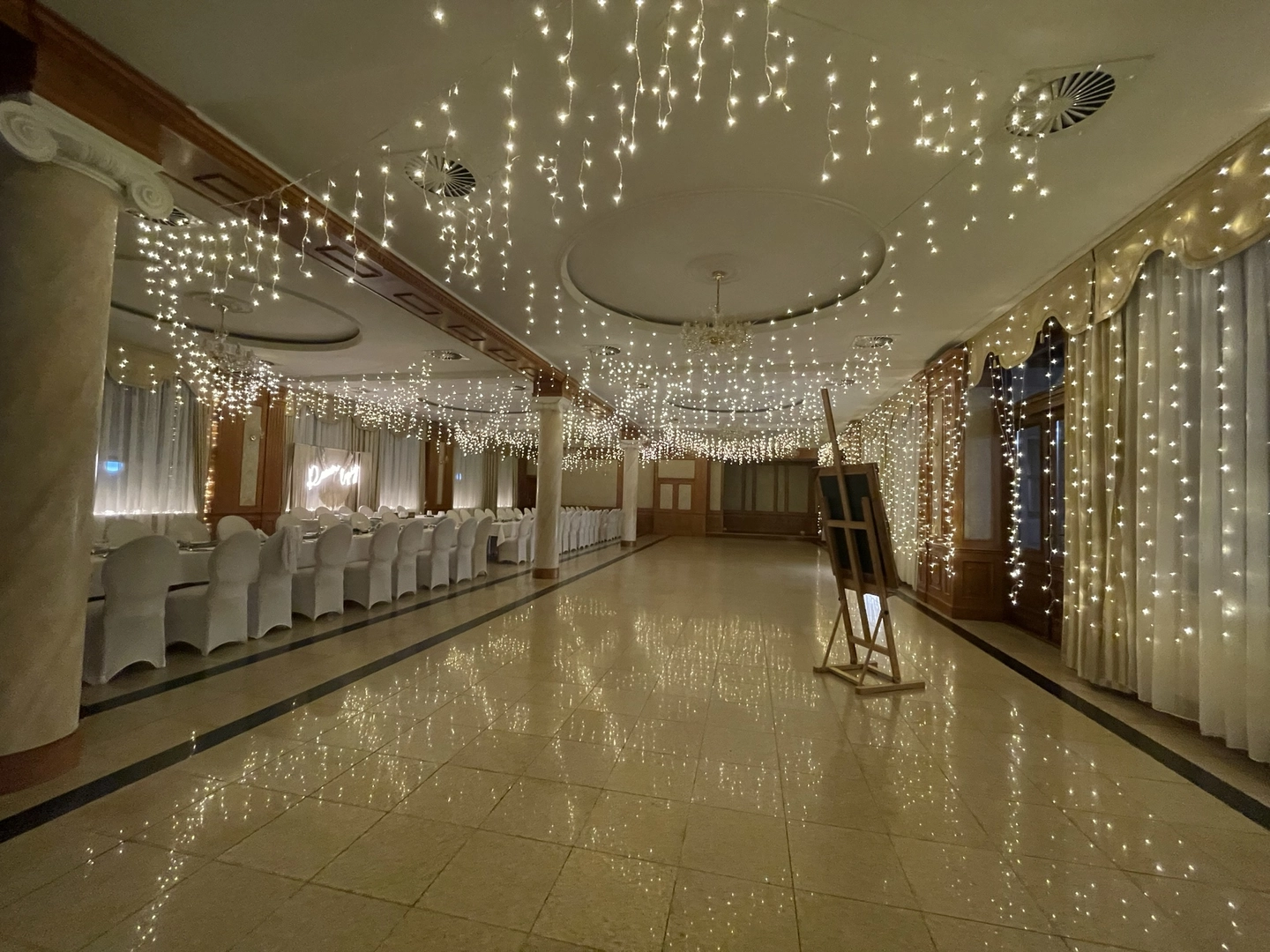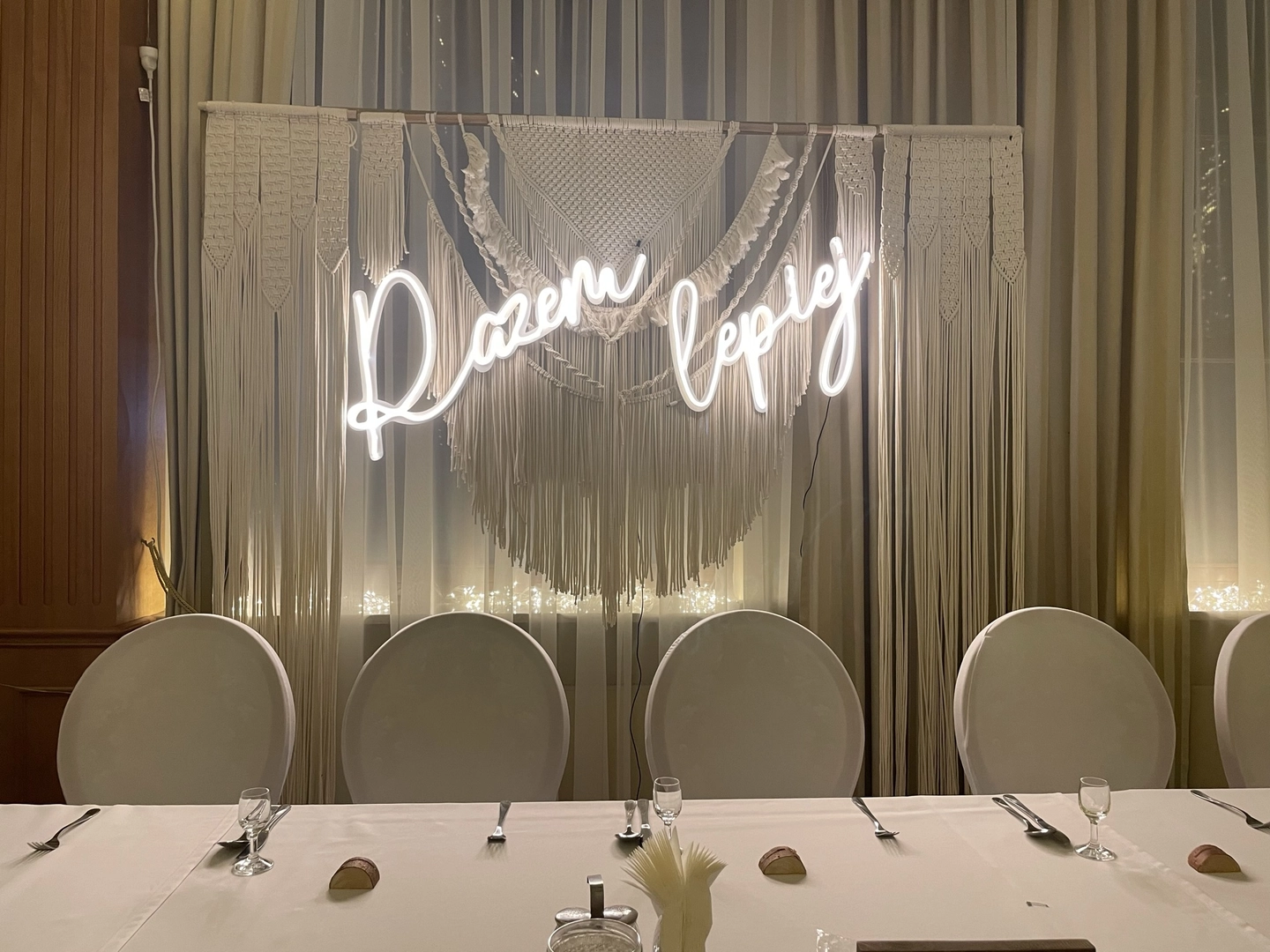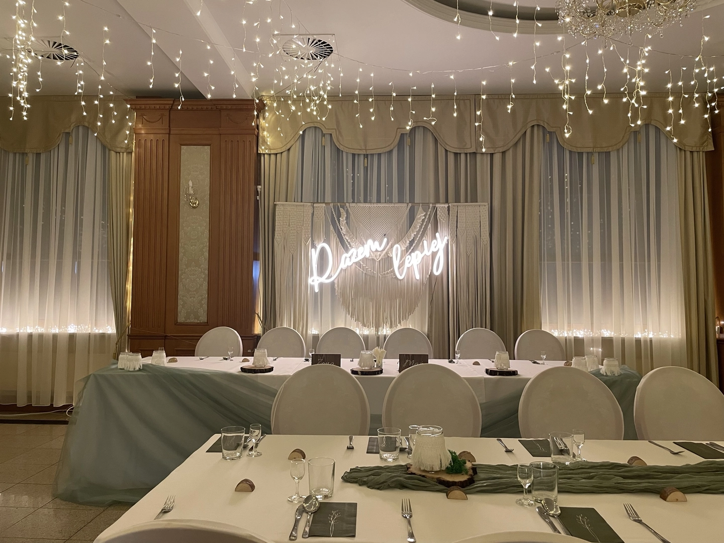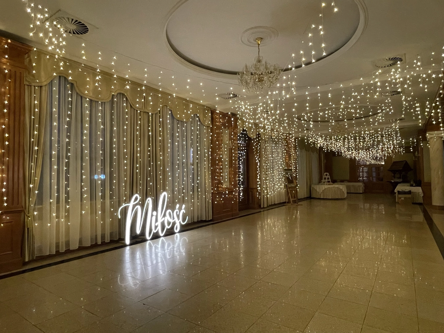 Dosyć częsty punkt na mapie naszych realizacji. Sala w hotelu "Stodółka" w podkieleckim Ćmińsku przede wszystkim wypełniała się światłem tysiąca lampek i napisów ledowych. Dla każdej pary przygotowaliśmy wyjątkową ściankę za stół prezydialny. Prosty układ sali doskonale nadaje się na eksperymenty z aranżacjami. Jeśli planujecie wesele właśnie w tym miejscu to możecie liczyć na naszą pomoc i gwarancję zadowolenia z efektów.